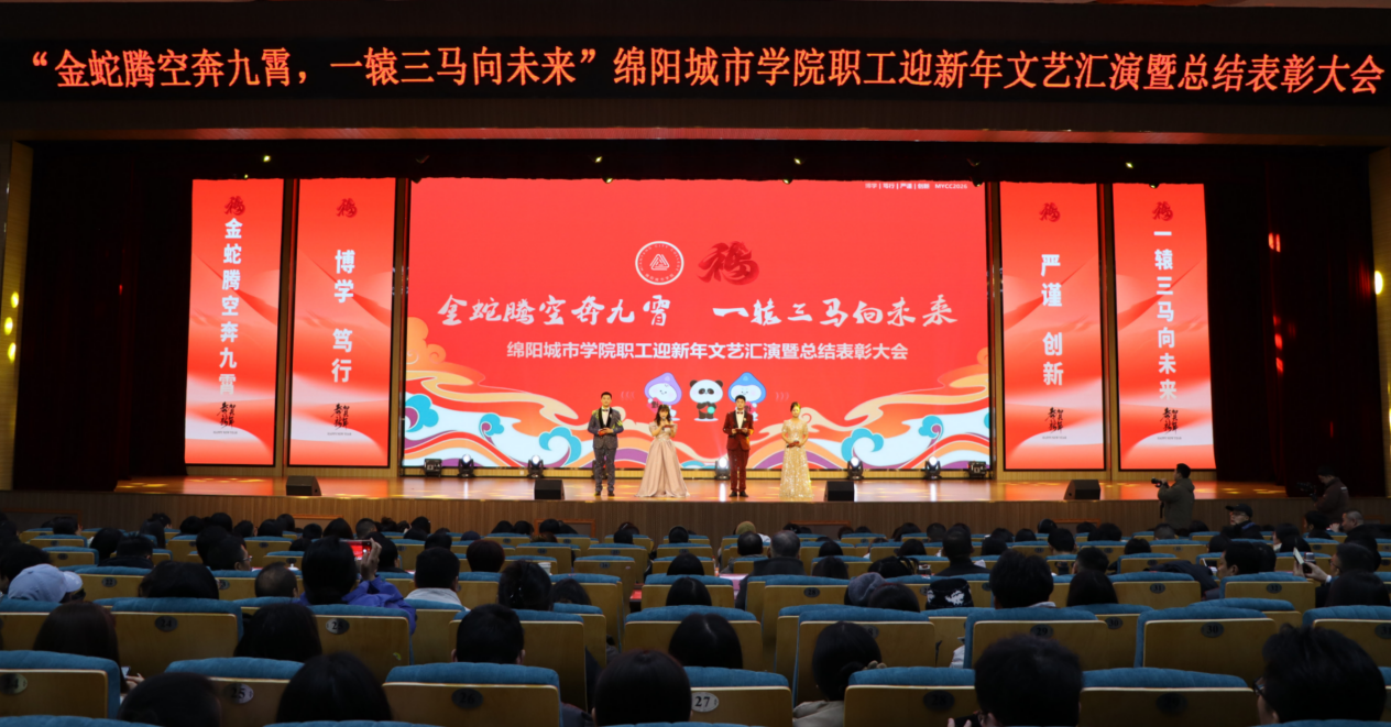 1月21日,绵阳城市学院“金蛇腾空奔九霄,一辕三马向未来”职工迎新年文艺汇演暨总结表彰大会在安州校区守正书院二楼演播厅隆重举行。校领导班子成员与全体教职工齐聚一堂,共忆2025年耕耘岁月,共绘2026年发展蓝图,以饱满昂扬的姿态迎接新一年的到来。