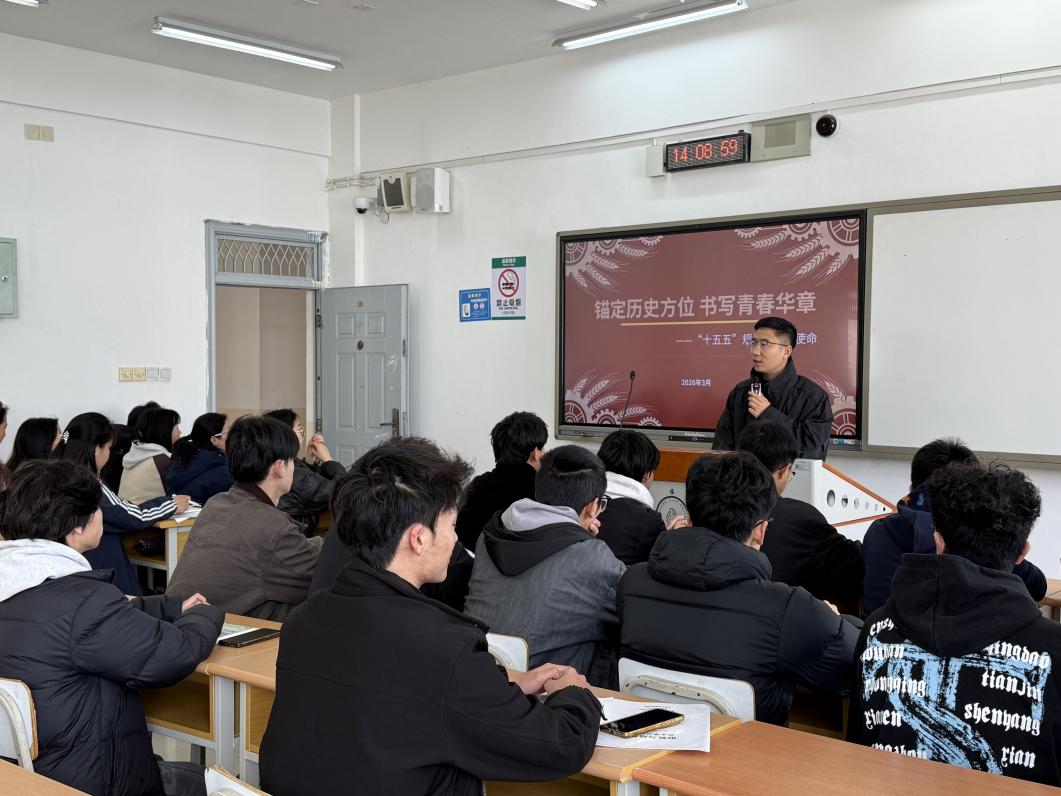 副校长钟磊副教授以国家发展规划为主线,带领学生回顾了“一五”至“十四五”规划发展成就,重点阐释了“十五五”规划战略意义,结合00后学生成长的历程与国家重大发展变革,引导学生感悟时代成就、肩负历史使命,在新征程上勇毅前行。